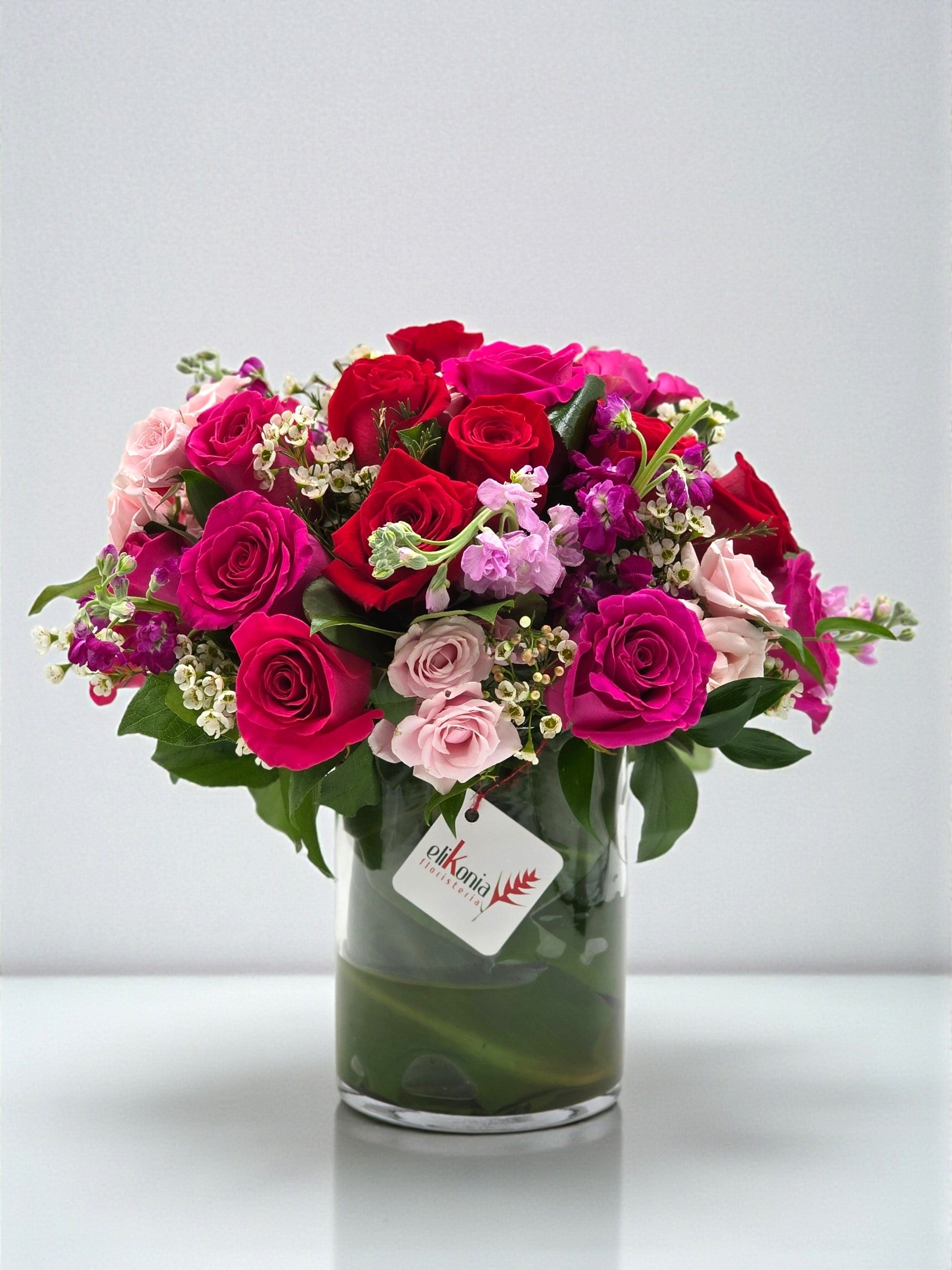 Un diseño armonioso y romántico que celebra el amor en todas sus facetas. Rosas en tonos intensos y suaves se combinan con delicados acentos florales para crear una composición equilibrada que transmite pasión, ternura y conexión real. Ideal para regalar cuando el amor se siente completo y bien compartido.