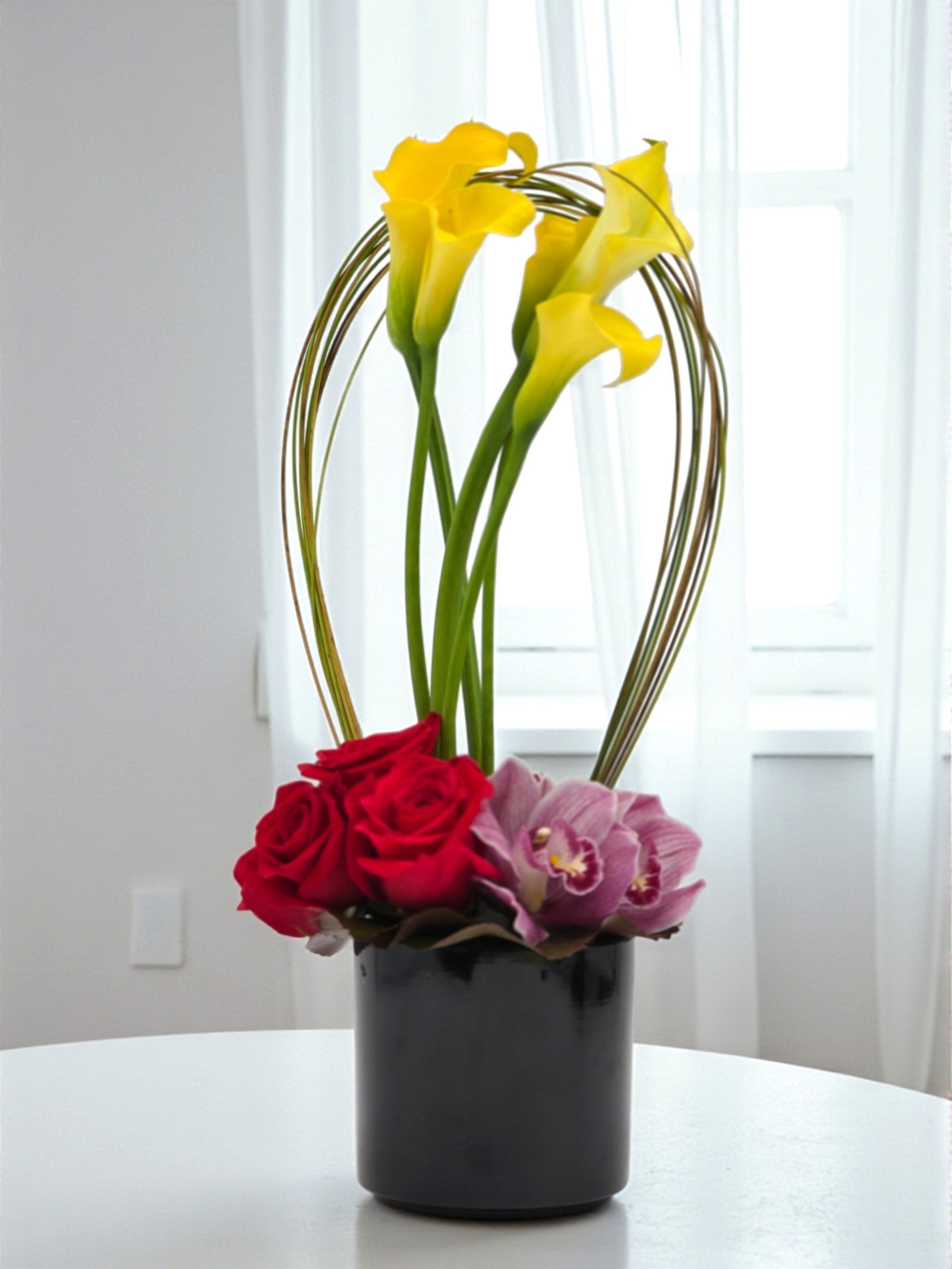 Un diseño moderno y sofisticado que celebra la atracción que nace con intención y se vive con elegancia. Rosas rojas intensas, calas amarillas y cymbidium se unen en una composición armoniosa que expresa deseo, admiración y distinción. Ideal para regalar cuando la conexión es clara y el sentimiento es real.