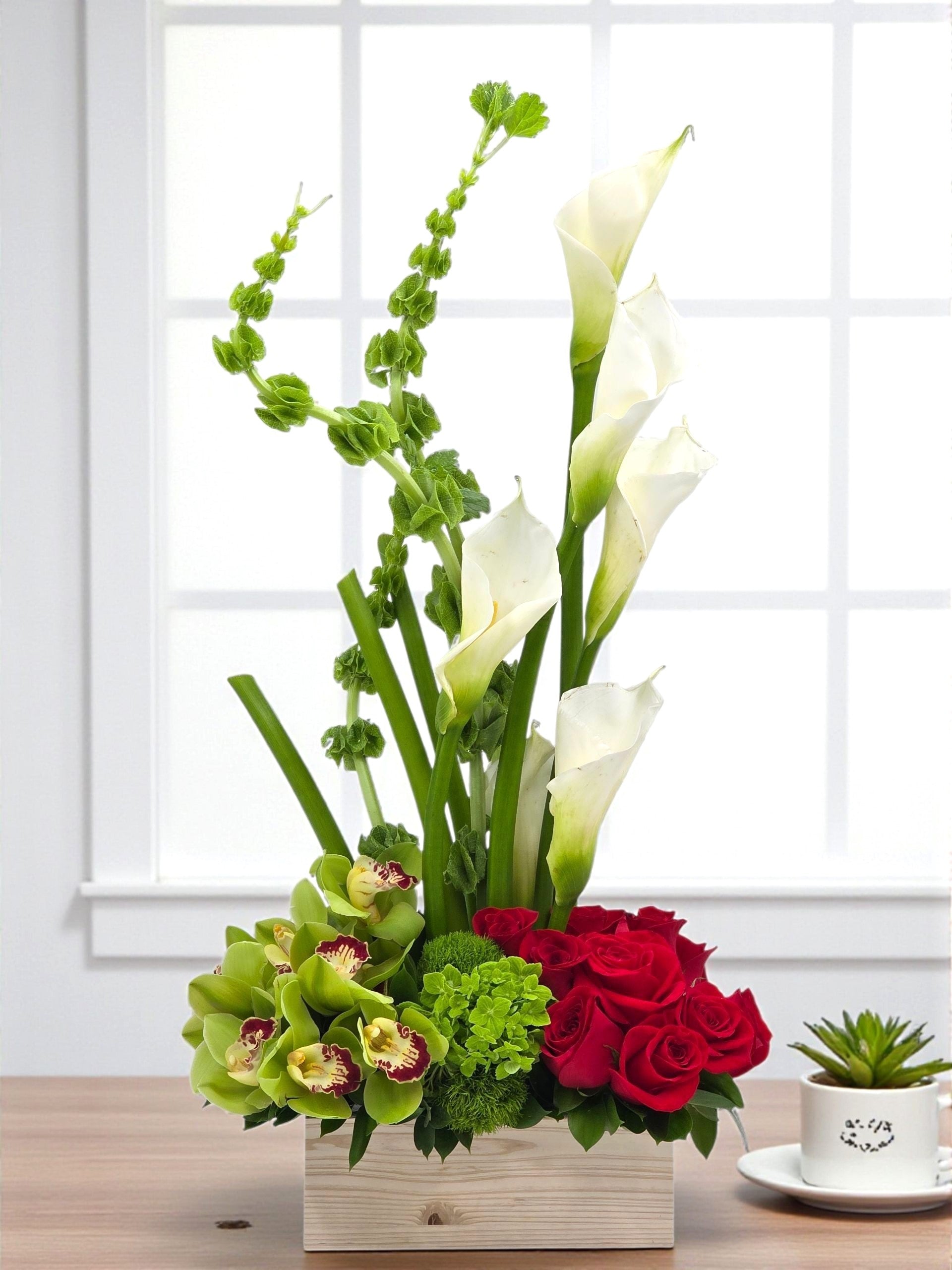 Un diseño sofisticado que une la elegancia de las calas blancas, la intensidad de las rosas rojas y la distinción del cymbidium verde. Creado para expresar un amor fuerte, estable y profundamente significativo. Ideal para quienes entienden que amar también es equilibrio.